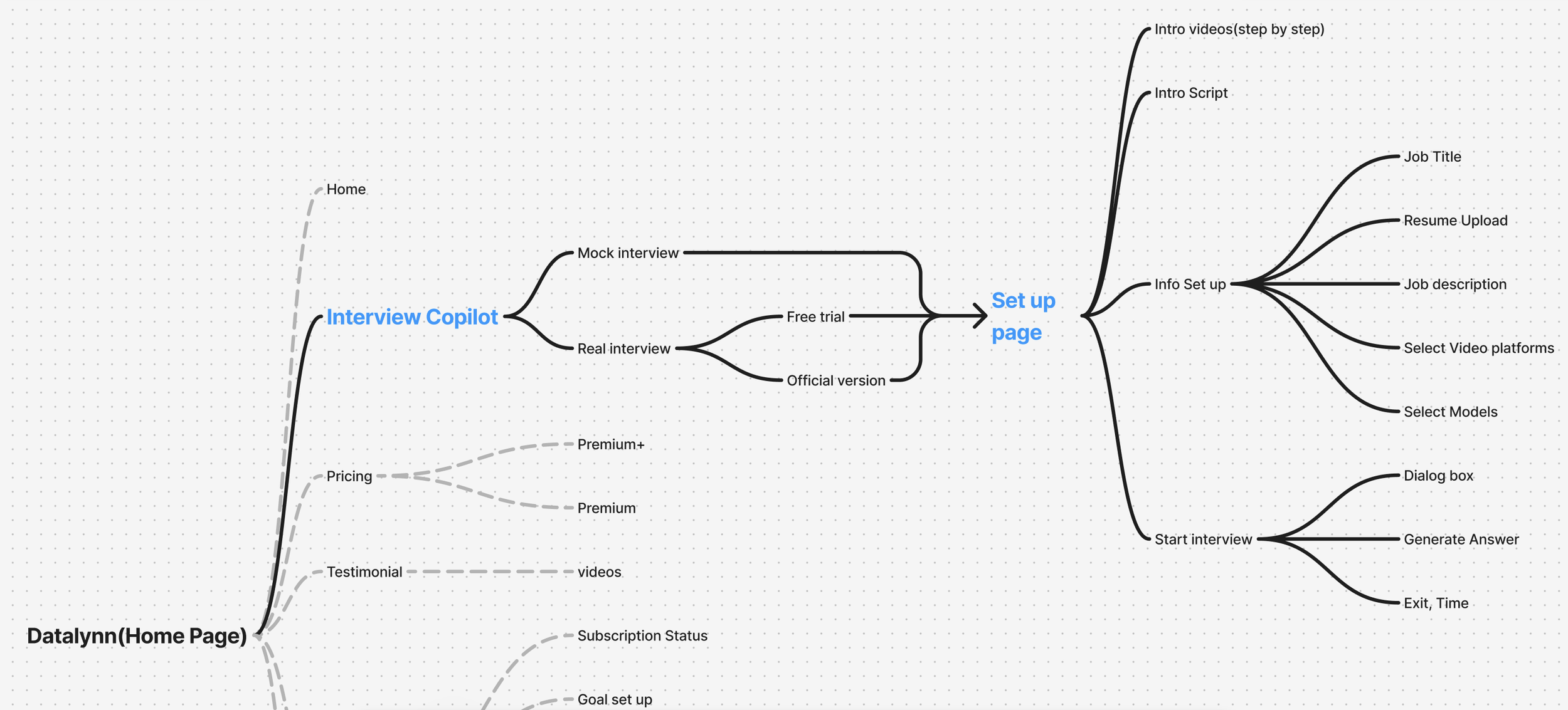The information architecture of Datalynn Interview Copilot outlines the overall structure of the product, balancing core functionalities and supporting features. This diagram highlights the core simulation workflow while including secondary elements to provide a comprehensive view of the system.